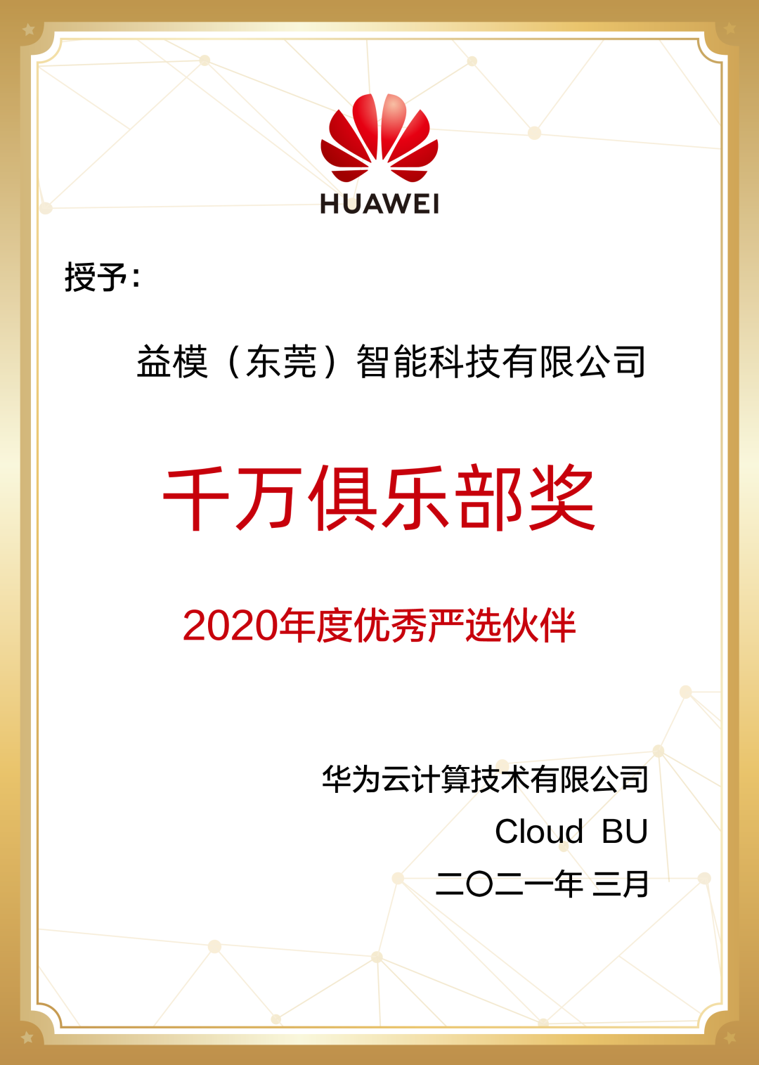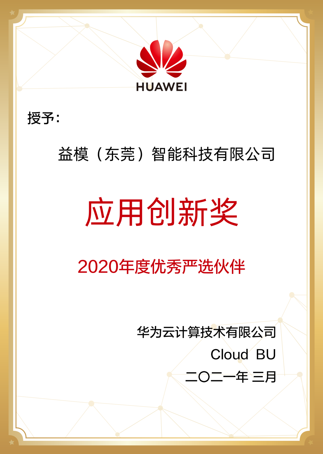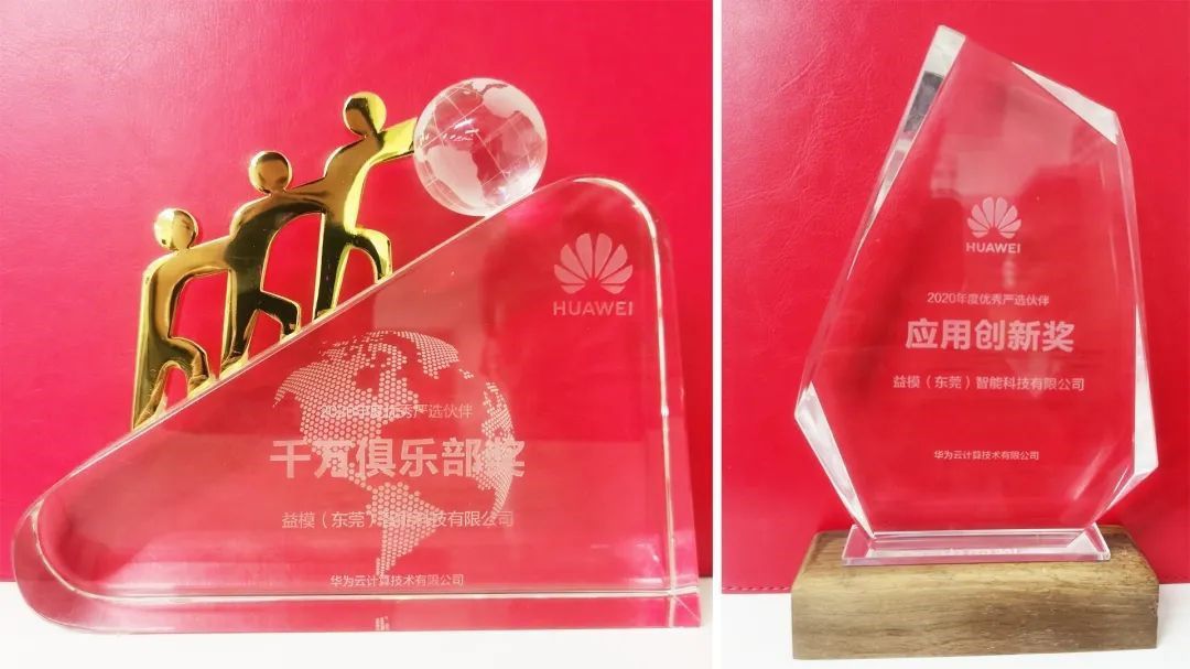 近日,益模作为华为云严选商城优选级伙伴,荣获华为云“2020年度优秀严选伙伴·应用创新奖”、“千万俱乐部奖”。