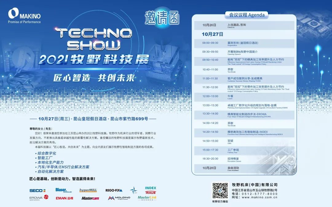 一年一度的技术盛会“牧野科技展”于10月27日、10月29日,11月3日、11月5日在牧野中国昆山总部成功举办。本届科技展以“匠心制造、共创未来”为主题,从综合数字化、智能工厂、自动化解决方案等方面向业内朋友展示最新技术与最前沿的解决方案。