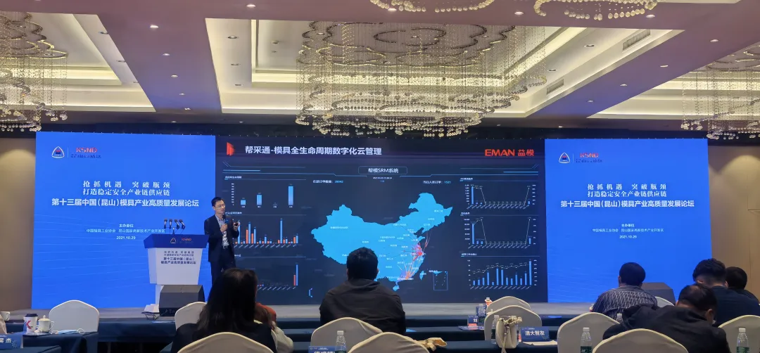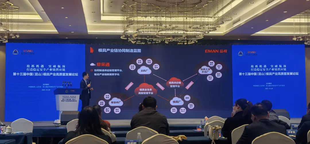 益模董事长、中国模具工业协会数字化信息化委员会主任易平博士做《模具产业集群的数字化协同实践》报告,他指出未来企业之间, 产业之间,乃至国家之间的竞争很大程度上是供应链的竞争。整个主题报告易平博士从供应链管理对企业发展的重要性出发,运用客户实际案例,分享了益模在模具供应链云管理平台上的成果。