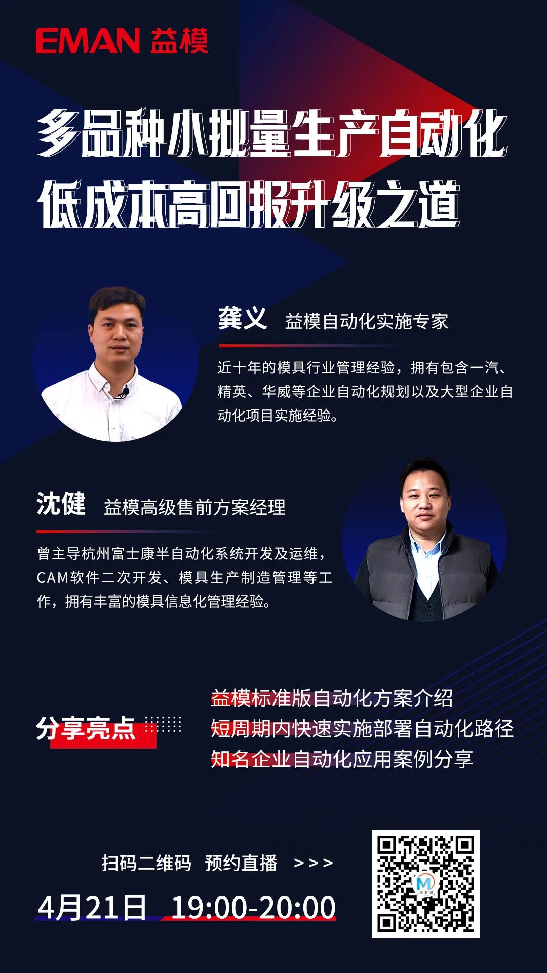 更多关于标准版自动化柔性加工、检测解决方案的讲解、低成本/高回报自动化部署经验之道及知名企业案例实践,4月21日(周四)晚上19:00-20:00,模具圈视频号直播间见。