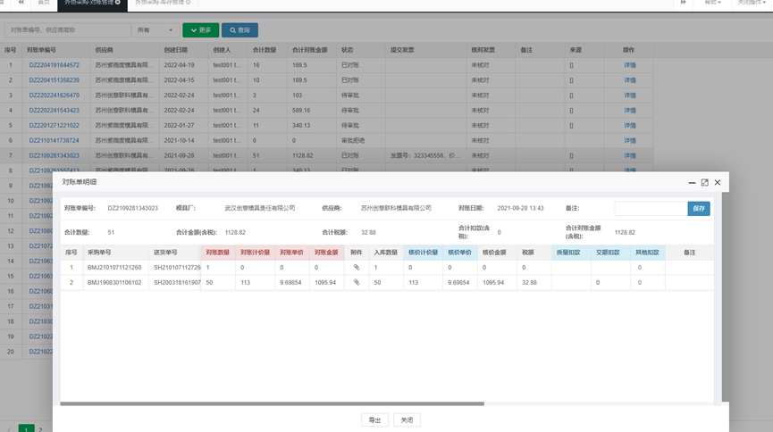 帮采通系统内,外协、采购数据入库后,所有的信息都能在系统上快速查看确认,保证了双方数据的一致性。供应商可在帮采通中直接提交对账,信息会自动同步至相应采购,采购只需点击对账按钮,系统便会自动把和采购一致的数据完成对账,把不一致的数据提醒给采购,针对加工过程中因质量和交期产生的扣款在对账单中也会呈现出来,双方可继续确认,极大提升了对账效率。