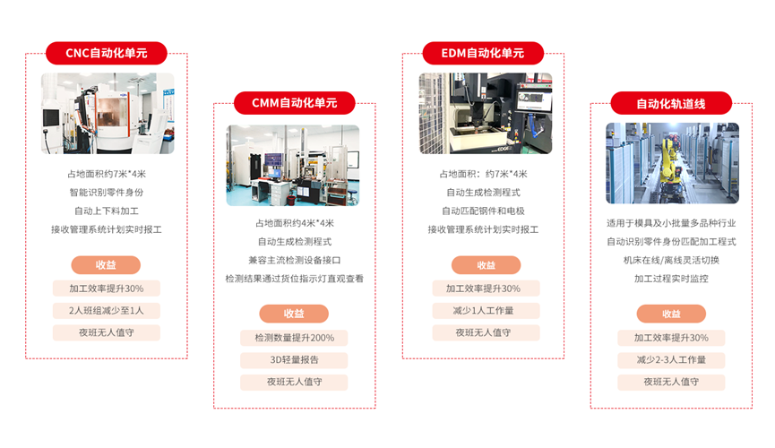 支持单工序、多工序的柔性组合,不限定零件的类型、尺寸、质量、形状,组合电极以及钢件CNC加工,EDM加工,CMM检测配置,自动化线可灵活支持后期设备扩展规划,可兼容GF、北京精雕、牧野、发那科、三菱、海克斯康、蔡司等主流多品牌型号设备。