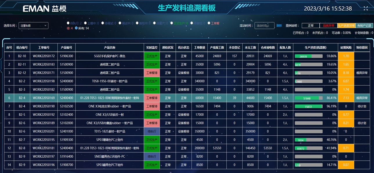 注塑作为典型的离散制造行业。实际生产过程中,不仅面临到品种多,换产频繁等问题,同时,生产过程涉及众多方面协同,如来料检验、原料出库、烘料安排、模具准备、注塑调机、首件、巡检、入库检验等等,工作繁多、人员分工复杂,极易出现换产周期长,产品合格率低,设备OEE不达标,在制品积压,库存压力大等生产效率低下的情况。