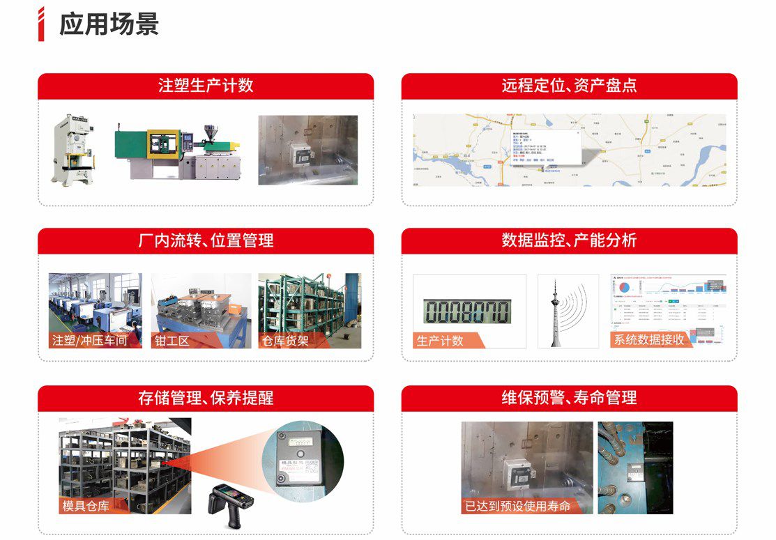 注塑企业因为没有实时监控模具生产与活动数据,在生产中常有误用坏模、停用待修理模具等现象,影响生产进度与交期。益模模具全生命周期管理系统以物联为基础,将云平台与智能终端相结合,帮助企业实现模具全生命周期管理,在注塑生产计数、模具远程定位及资产盘点、维保监控、产能分析等场景下均可适用。