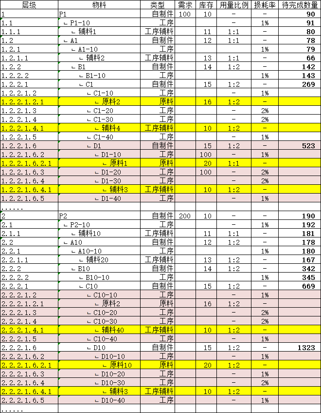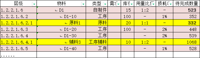 针对多产品、小批量、多工序的生产模式,尤其是工序与工序之间不经过库存,直接在车间进行流转的准时制(JIT)生产方式,对车间的在制件(WIP)数量的控制和利用尤为重要。在自制件【D1】的生产过程中,每道工序【D1-10至D1-40】都需要考虑自身的在制件(WIP)数量、损耗率,以及与之关联的工序的WIP量和损耗率。同时,还需考虑工序所需的辅料用量比例,据此得出计算结果。