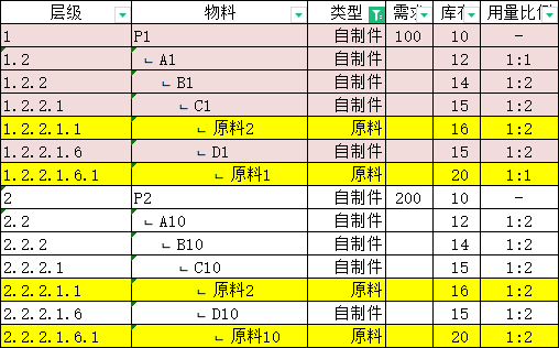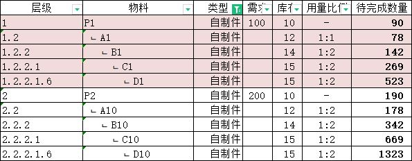APS-AP物料计划综合考虑成品件与半成品件现有库存,以及不同层次BOM的用料比例,从而计算出每个自制件所需的生产数量。