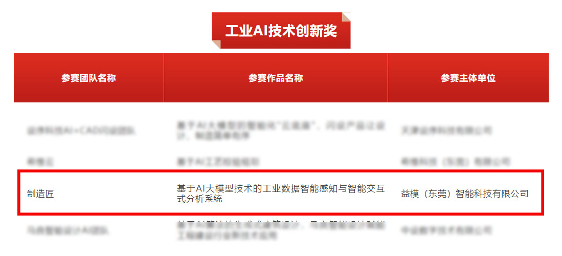 本次大赛中,益模凭借参赛作品“基于AI大模型技术的工业数据智能感知与智能交互式分析系统”荣获“工业AI技术创新奖”,充分益模展示了益模在AI与智能制造融合领域的深厚实力和创新能力。值得一提的是,这也是益模第三次在工业软件创新应用大赛中荣获奖项。