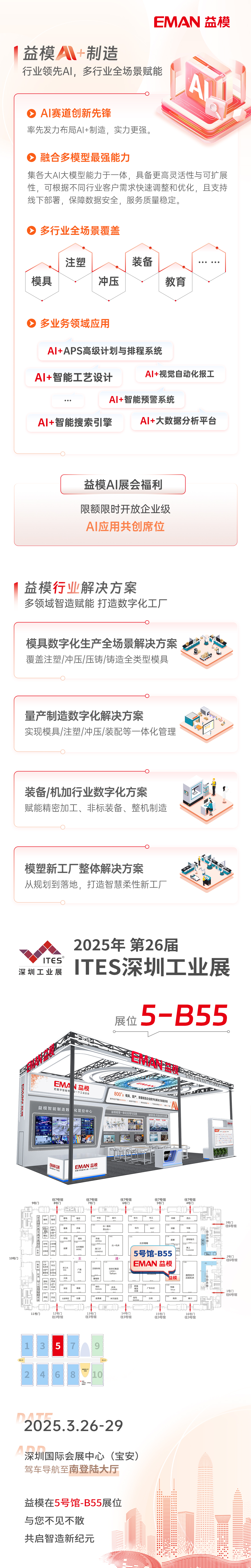 2025 ITES深圳工业展,益模不仅带来全场景、全链路的数字化转型解决方案,益模AI应用也将重磅亮相5号馆-B55展位,为您呈现一场“未来工厂”的沉浸式体验,助您抢占智造高地!