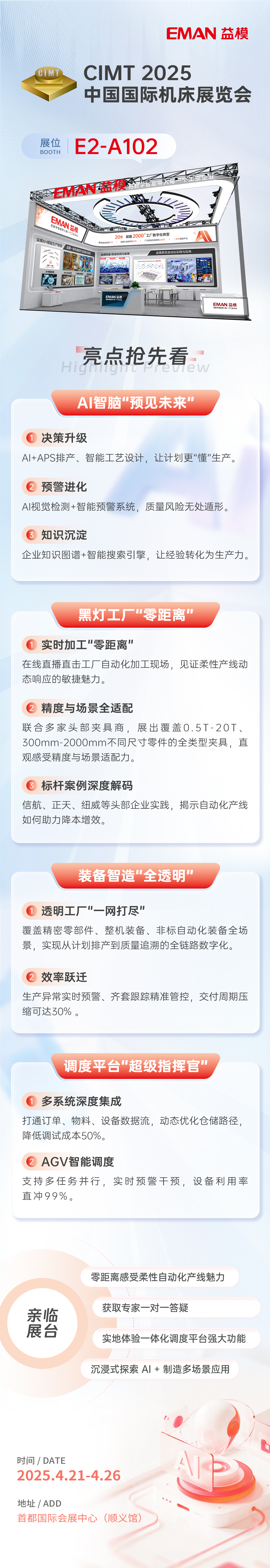 2025年4月21-26日,全球顶级机床展之一中国国际机床展览会CIMT 2025即将在北京中国国际展览中心 (顺义馆)启幕! 益模柔性自动化、装备数字化、智能仓储物流、一体化调度平台、AI+制造等解决方案,将亮相E2号馆-A102展位,与您共探智能制造新增长!