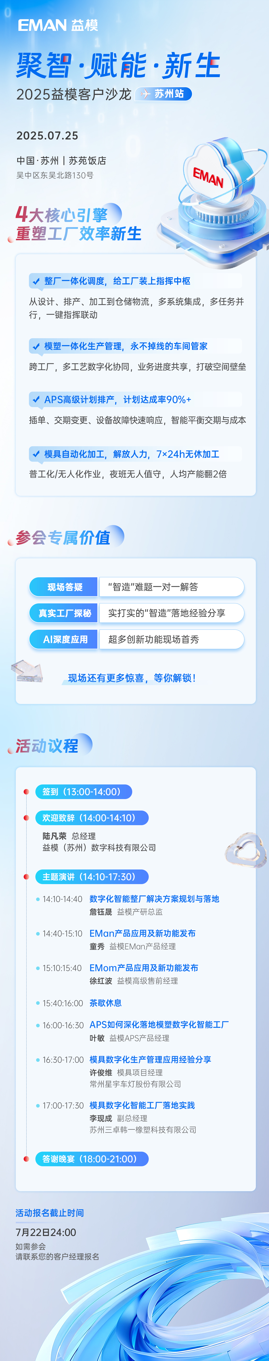 7月25日,益模携20年“智造”经验,将在苏州举办模塑数字化沙龙活动,集结智造先锋与实战专家,精准呈现数字化落地路径,助力企业将生产数据转化为精准盈利的新利器。