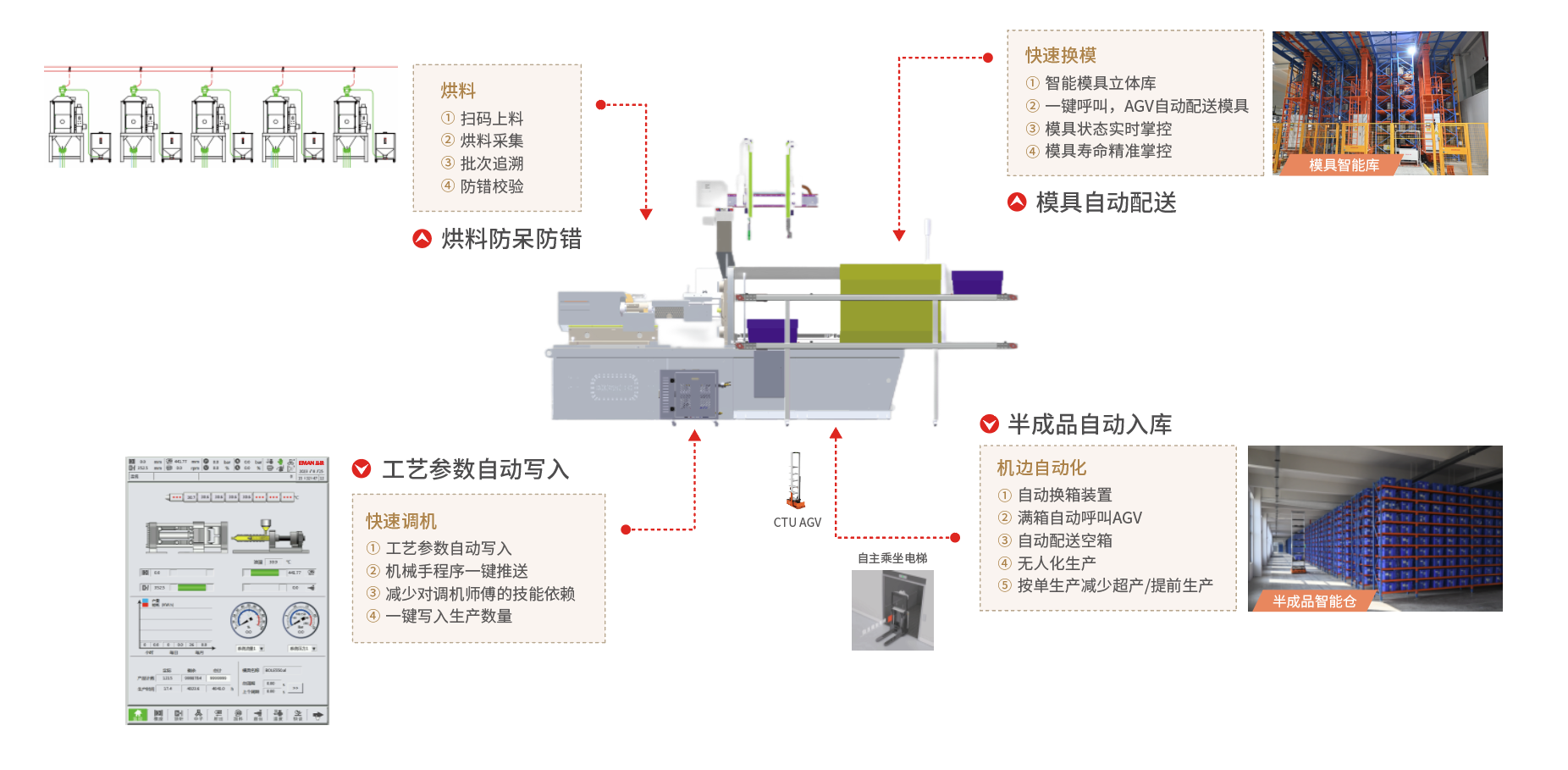 机边自动化,注塑件自动生产配送,减少超产与调机依赖。