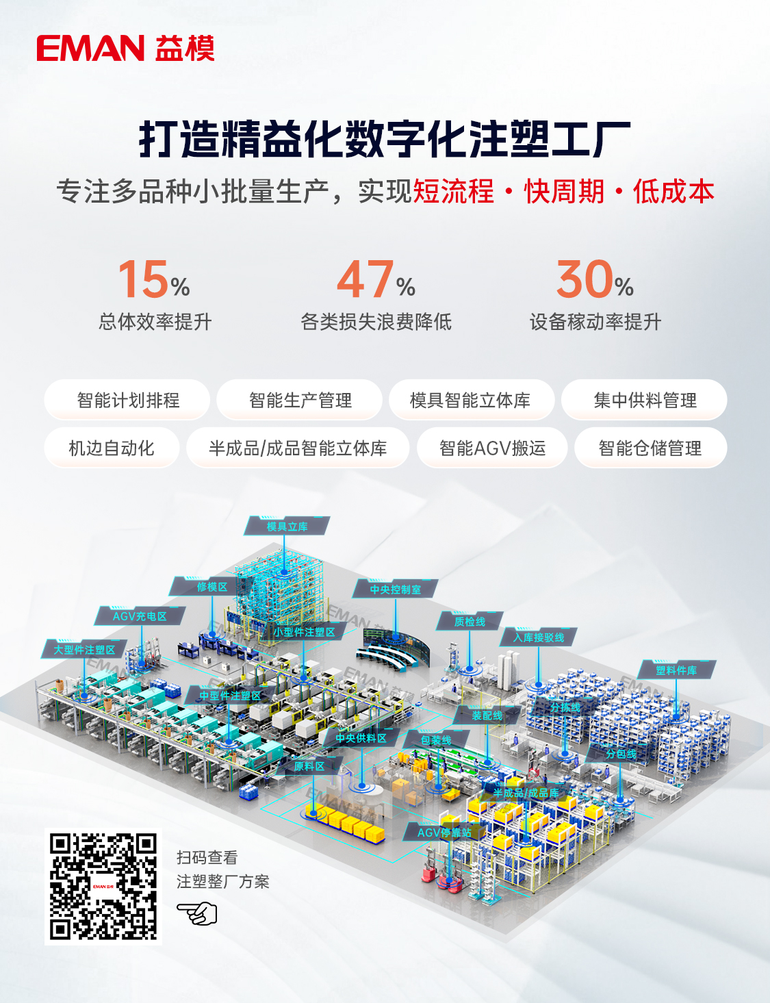 筹备智能化新工厂,是决定企业未来竞争力的关键一跃!是沿用旧模式,陷入“产线孤岛、数据断链”的困境?还是拥抱益模注塑整厂数字化方案,构建“全链路闭环”数字化工厂,实现高效、高品质、低成本智能生产,赢得市场先机? 选择益模——值得信赖的数字化伙伴,开启您的智能新工厂卓越之旅。